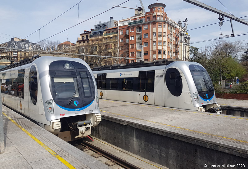 Basque Railways now operate under the brand of Euskotren Trena, and trains are all formed of Class 900 or 950 units built locally by CAF. Two of these units are seen waiting departure from Amara terminus in San Sebastián on 29 March 2023. |